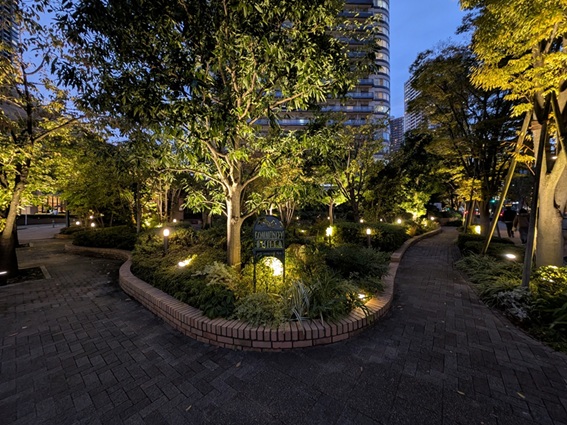 犬が反対側に行くのでふれあいの丘の周りを歩くと、ミッドスカイタワーをバックにした植栽のライトアップがとてもきれいでした。