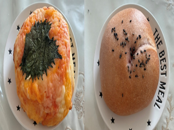 写真は、人気の明太チーズ(左下)とさつまいも(右下)のベーグル。